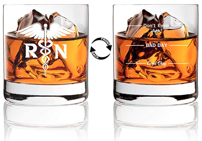 Whiskey glasses are becoming an increasingly popular gift for male nurses, especially since the increase in the number of microdistilleries. These two-sided "Good Day Bad Day Don't Even Ask" RN whiskey glasses will make anyone laugh. They are dishwasher safe and hold 11 ounces of the beverage of your choice.